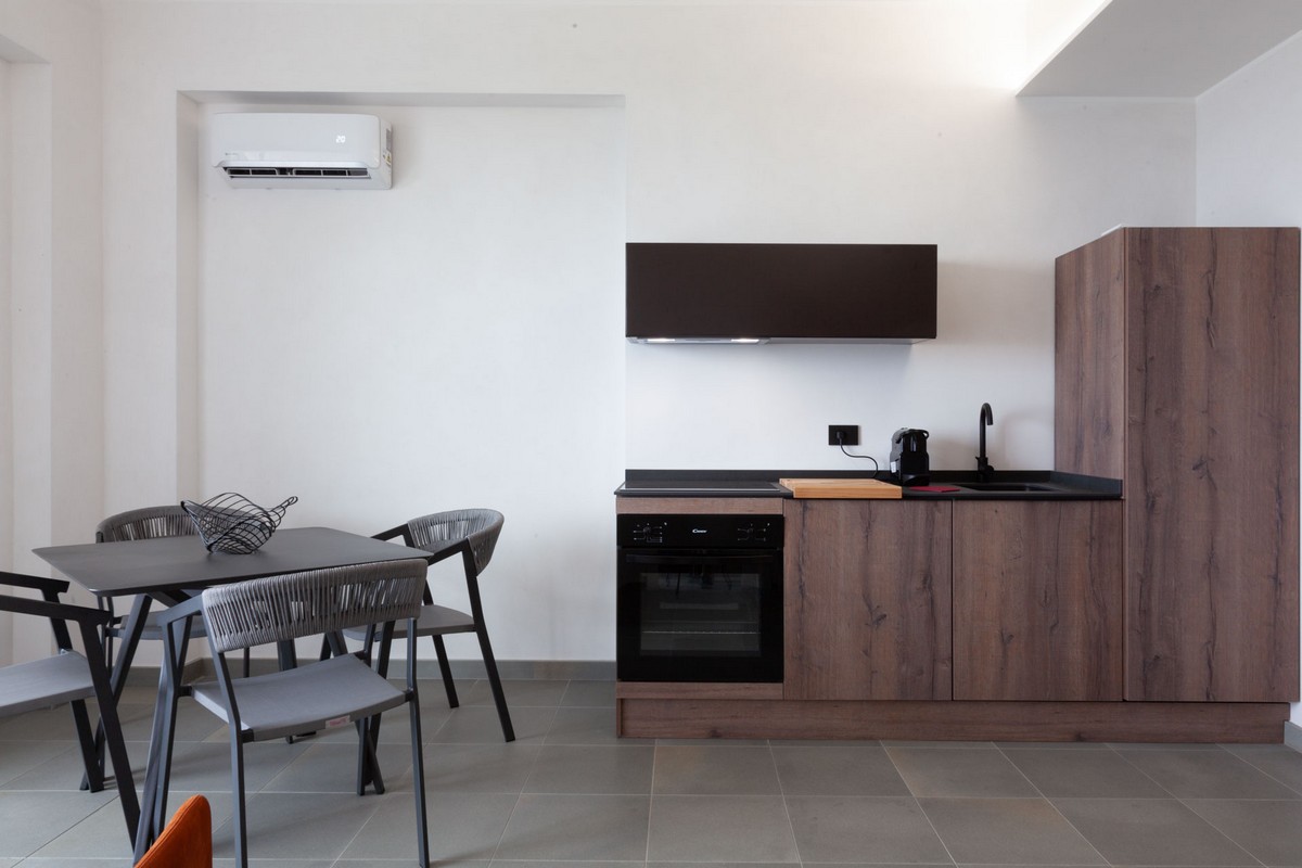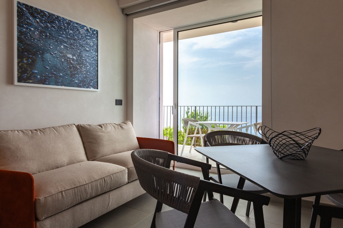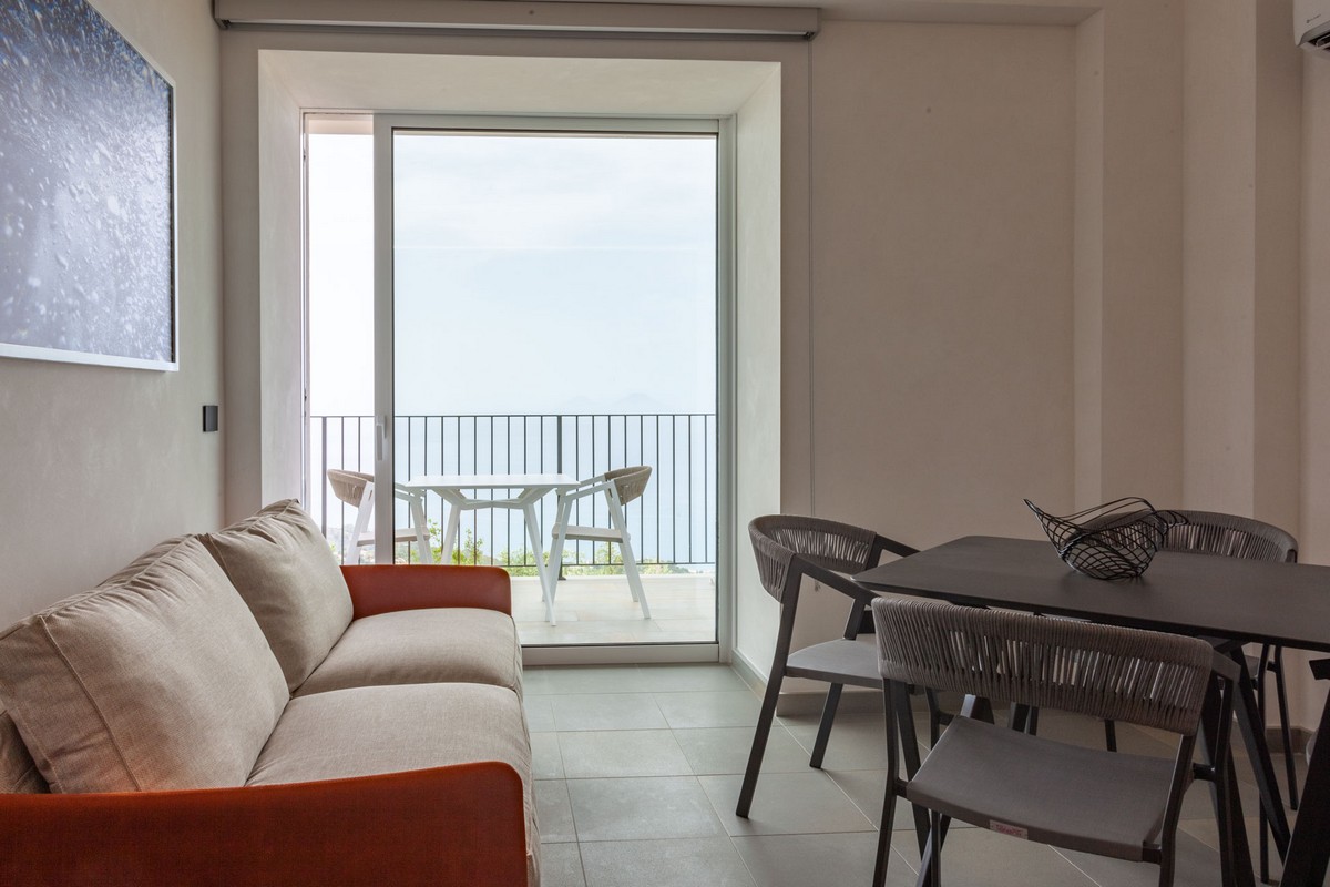 · Area living con cucina attrezzata, tavolo da pranzo e divano letto, ampia vetrata su terrazzo vista mare