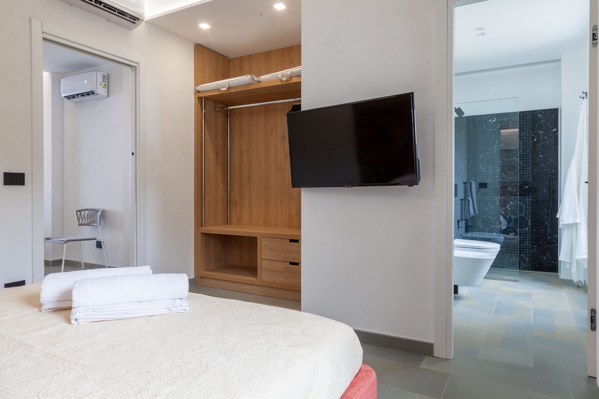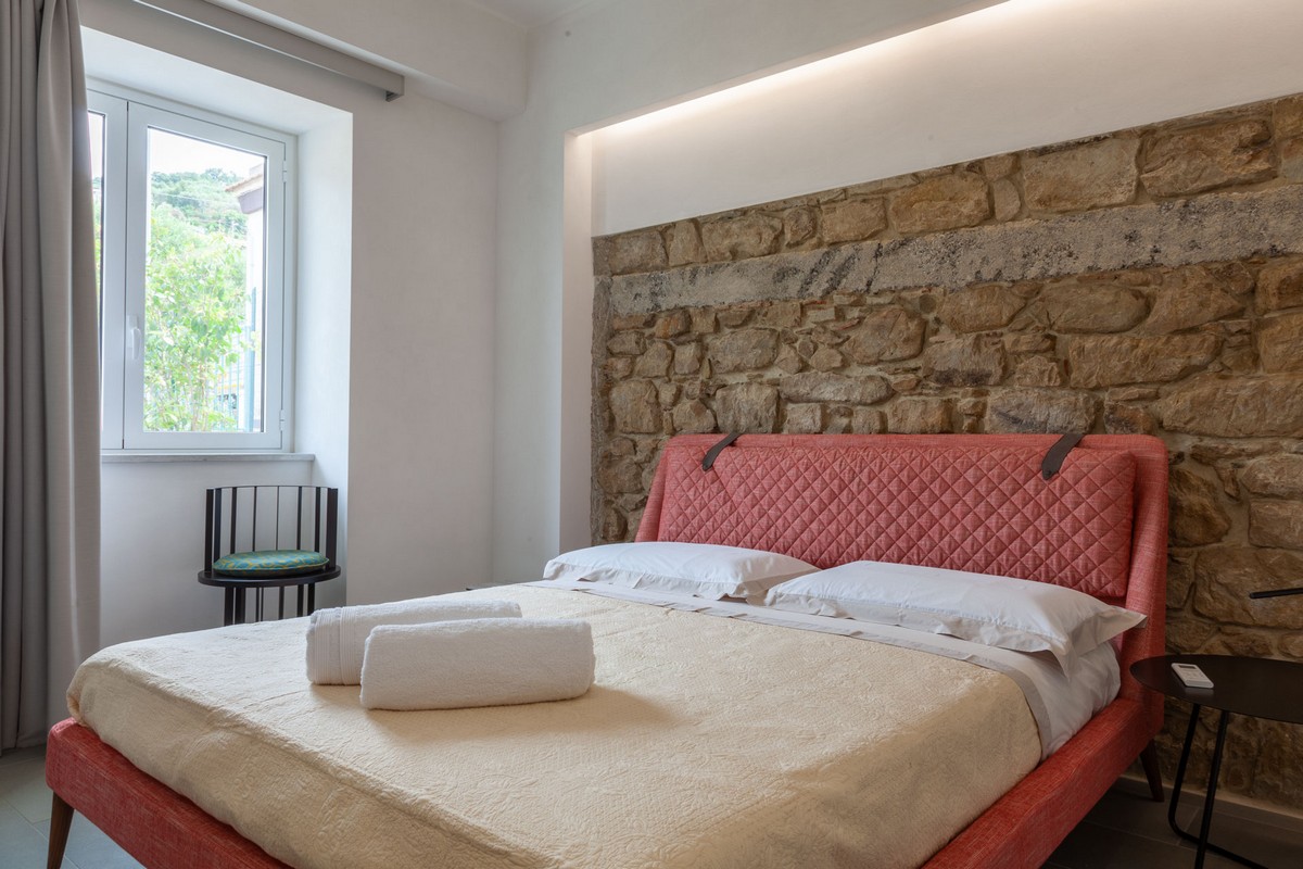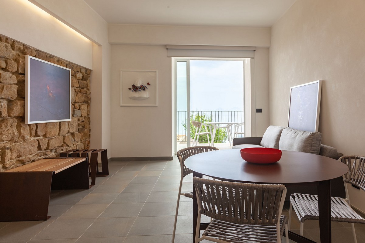 · Area living con cucina attrezzata, tavolo da pranzo e divano letto, ampia vetrata su terrazzo vista mare